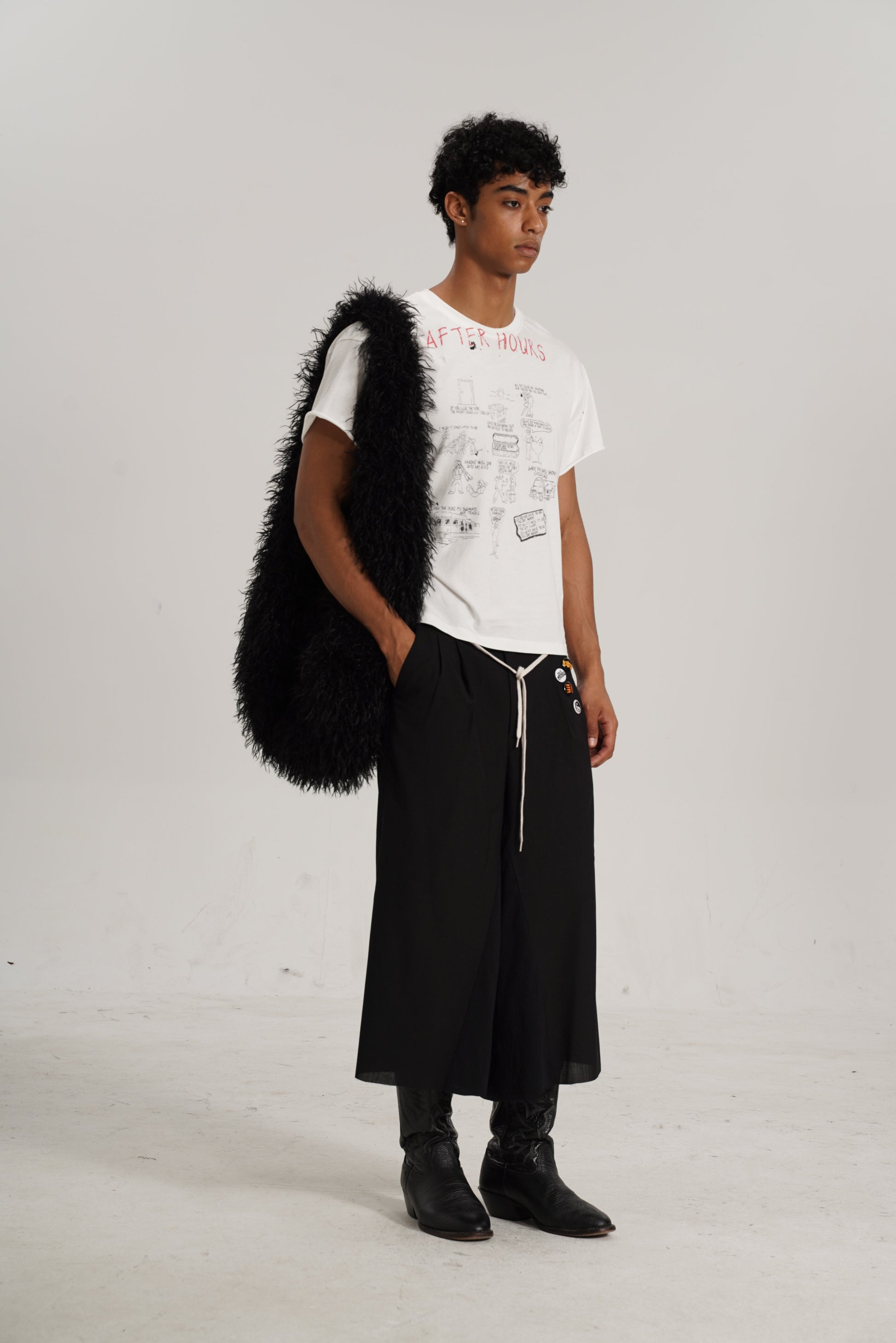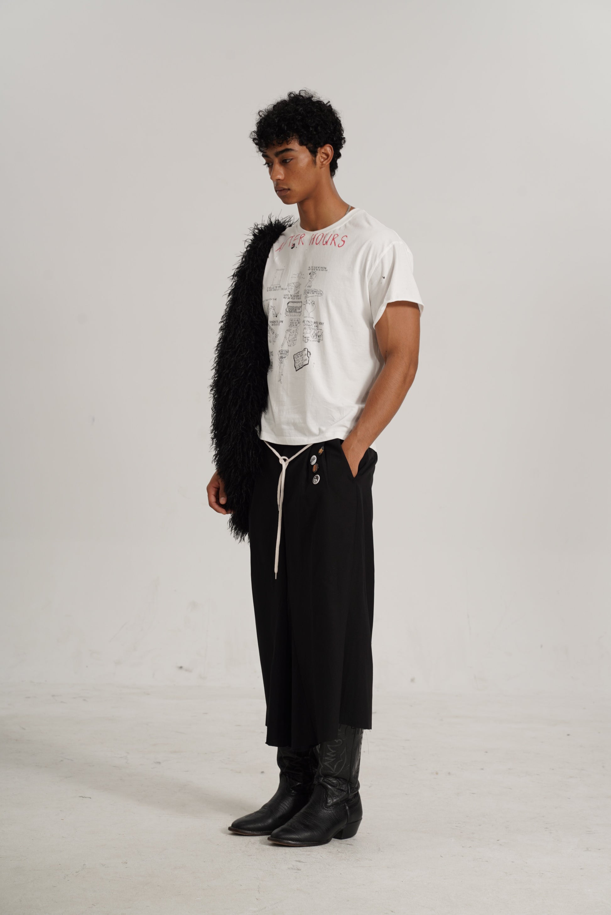 INTRODUCING OUR "AFTER HOURS" GRAPHIC TEE, A MUST-HAVE FOR THE MODERN INDIVIDUAL WHO EMBRACES ARTISTIC EXPRESSION. THIS WHITE T-SHIRT FEATURES HAND-DRAWN SKETCHES AND TEXT, CREATING A PLAYFUL AND INTRIGUING DESIGN THAT INVITES CLOSER INSPECTION. CRAFTED FROM SOFT, HIGH-QUALITY COTTON, IT OFFERS BOTH COMFORT AND DURABILITY. THE RELAXED FIT AND DISTRESSED DETAILS, INCLUDING SMALL HOLES, ADD A TOUCH OF REBELLIOUS FLAIR. PERFECT FOR MAKING A STATEMENT, THIS TEE EMBODIES A CASUAL YET EDGY AESTHETIC, IDEAL FOR THOSE WHO LIVE LIFE ON THEIR OWN TERMS.