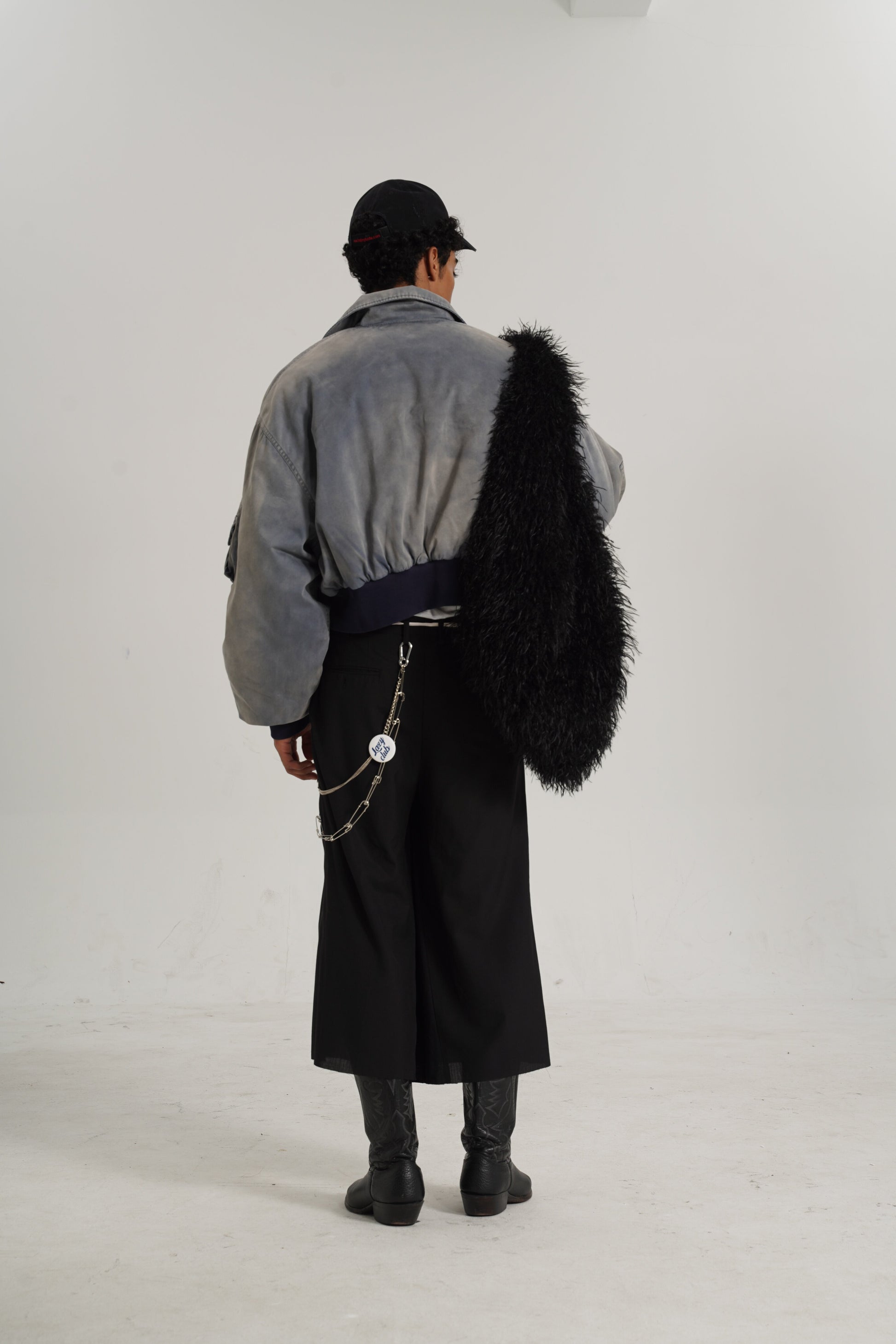 INTRODUCING OUR NEW STANDOUT BOMBER JACKET, METICULOUSLY CRAFTED TO BLEND VINTAGE CHARM WITH CONTEMPORARY FLAIR. THE WASHED-OUT GREY FABRIC, WITH ITS RUGGED, DISTRESSED FINISH, CREATES A BOLD, URBAN AESTHETIC THAT'S BOTH TIMELESS AND MODERN. WE'VE INCORPORATED A CLASSIC STAND COLLAR, RIBBED CUFFS, AND HEM IN CONTRASTING DARK TONES TO MAINTAIN THE AUTHENTIC BOMBER SILHOUETTE. THE PRACTICAL YET STYLISH CHEST FLAP POCKETS AND ZIPPERED SLEEVE POCKET ADD UTILITY WITHOUT COMPROMISING ON DESIGN.